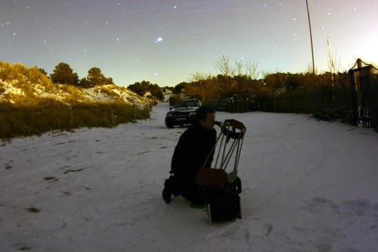 Mit einem OIII-Filter kann man schön die einzelnen Filamente des Cirrusnebels abfahren, und wer einen Hß-Filter einschraubt, kann sogar bei bestem Himmel die ersten Konturen des Pferdekopfnebels entdecken. Die heute in Mode gekommenen apochromatischen Reiserefraktoren können hier in Bezug auf Lichtsammelvermögen und Grenzgröße bei weitem nicht mithalten. Anders ist dies beim nutzbaren Gesichtsfeld. Hier ergeben sich aufgrund des gewaltigen Öffnungsverhältnisses von f/4 einige Einschränkungen. In der Mitte des Gesichtsfeldes ist die Bildqualität sehr hoch, die Beugungsfiguren weisen keine nennenswerte Abweichungen auf. Ein Newton mit einem Öffnungsverhältnis von f/4 zeigt allerdings schon sehr viel Koma, wenn man nur wenige Bogenminuten von der Feldmitte abweicht. Dies hat aber nichts mit der Qualität der Spiegelkomponenten zu tun, sondern ist rein bauartbedingt. Beträgt das Feld, in dem visuell noch kein Koma sichtbar ist beim 8“ f/4-Newton 39 Bogenminuten, so sind dies bei einem 8“ f/8-Newton bereits 58 Bogenminuten. Eine Weitfeldbeobachtung ist bei f/4 kein Genuss mehr, hier haben Refraktoren einen echten Vorteil. Als sinnvolles Zubehör zum Reisedobson ist auf jeden Fall die inzwischen erhältliche Stoffhülle anzusehen, sie schützt wirkungsvoll vor eindringendem Streulicht. Beim Test zeigte sich ohne Hülle häufig eine Aufhellung des Bildfeldes durch Fremdlicht. Außerdem schützt die Hülle etwas gegen das Beschlagen des Spiegels durch Taubildung. An der Nordsee muß der Spiegel bzw. alle Newtonspiegel durch eine optisch einwandfreie Folie gegen Salz geschützt werden. Es gibt hier bei der Firma Baader Planetarium eine „Turbo Film“ Folie, die zwar etwas Licht wegnimmt, dafür aber den Salzbelag wirkungsvoll abhält. Innerhalb von 5 Minuten, ist der Spiegel hier im Norden so mit einer Salzschicht beschlagen, daß eine Reinigung unumgänglich ist.