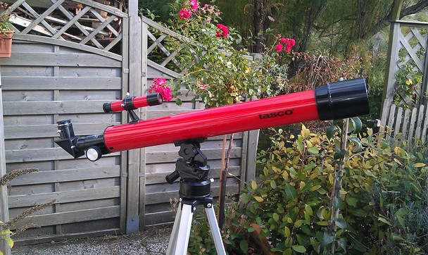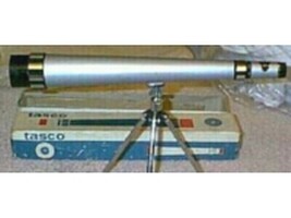 Zum ca. 10 Geburtstag 1981 bekam ich einen 50 mm Refraktor „Tasco 56T“. Ich hätte Platzen können vor Stolz – war das Instrument größer als ich… Leider mit einer Wackelmontierung aus Plastik und einer denkbar schlechten Optik. Der Okularauszug brach immer durch und ich hatte keine Freude daran – es wurde zurück geschickt.