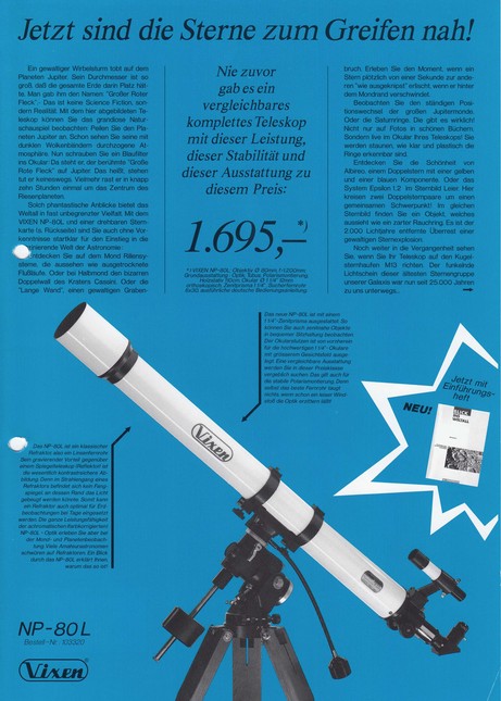 Der Wunsch eines jeden Astronomen ist nicht nur ein eigenes Teleskop, sondern eines immer größeren Instrumentes. Von der Firma Vehrenberg wurde ein Refraktor der Spitzenklasse angeboten. Unter der Marke „Vixen“ was soviel wie die Füchse bedeutet, erwarb ich am 13. Oktober 1992 ein 80 mm Refraktor mit 1200 mm Brennweite.